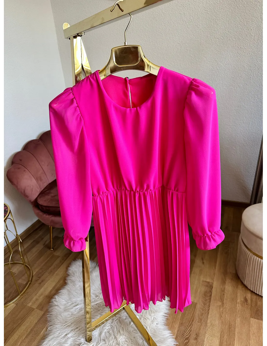 Točivé šaty v žiarivej ružovej farbe. Bez náhrdelníka. Talianska výroba.